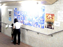 協催の地下鉄構内絵画展に見入る親子