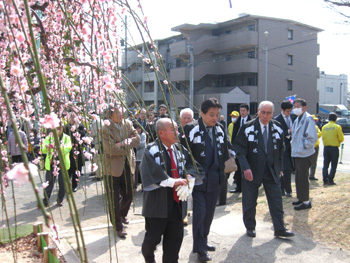 梅見交流会の目玉となった写真の枝垂れ梅は樹齢80年ほどの大木で中川区高畑の「理容ヤマダ」の庭で育てられたもの。