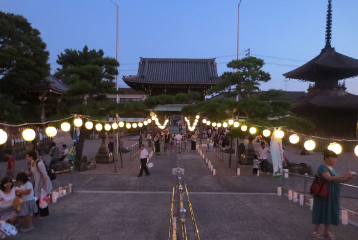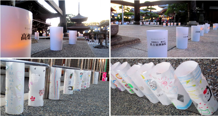 荒子の里協議会では、お盆の先祖供養のために行われる万灯供養に因み、2015年8月に初のランタンフェステイバルを実施し、今年で4回目になります。参拝者はペットボトルのランタンに願い事や絵を描いて境内に並べ、幻想的な光の揺らぎや提灯に照らされた観音寺の幽玄で神秘的な美しさを楽しみました。
