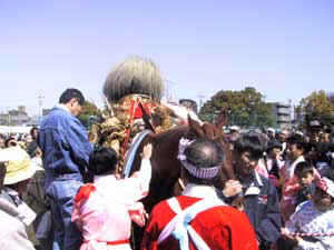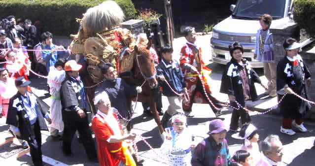 荒子の梅まつりで、38年ぶりに馬道具(ばどん)が馬上に飾られる。 2002/3/30