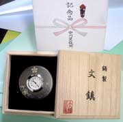 贈られた記念品は、錫製の時計付文鎮で表面には梅鉢紋と梅の花を配し、裏面には「中川区まちおこし大賞、前田利家発信隊2003・2の刻印」があり、2年間のさまざまな想いがこもった記念品です。
