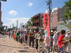 凛々しい甲冑武者やきらびやかな愛夢花会・侍前田利家音頭舞人に混じって多くの子どもたちやボランティアも参加。交通安全や防犯運動を啓発するプラカードに、にっぽんど真ん中祭り(かぶきもん祭)の旗も行進に参加し28日のどまつり開催のPRをしました。