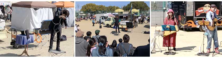 初日の土曜日は朝から青空の広がる好天気で、家族連れなど多くの来場者で終日賑わっていました。ふれあいステージイベントでは和太鼓の演奏や舞踏、ダンスなどが披露され、会場内では大道芸のパフォーマンスや子どもむけのふわふわ遊具にミニ新幹線で行列ができるほどの大人気でした。