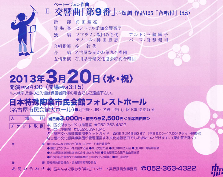 名古屋市文化振興事業団チケットガイド 052-249-9387 (平日9時〜17時チケット/郵送可)